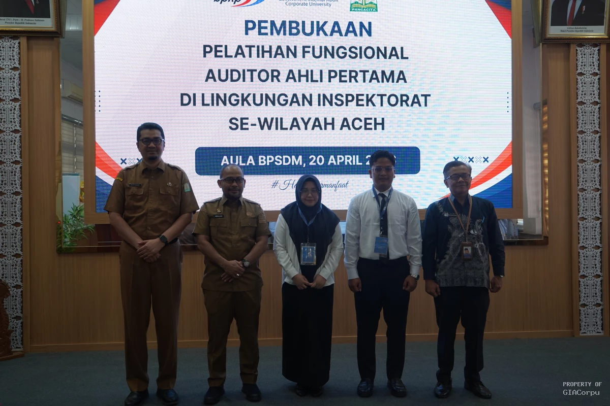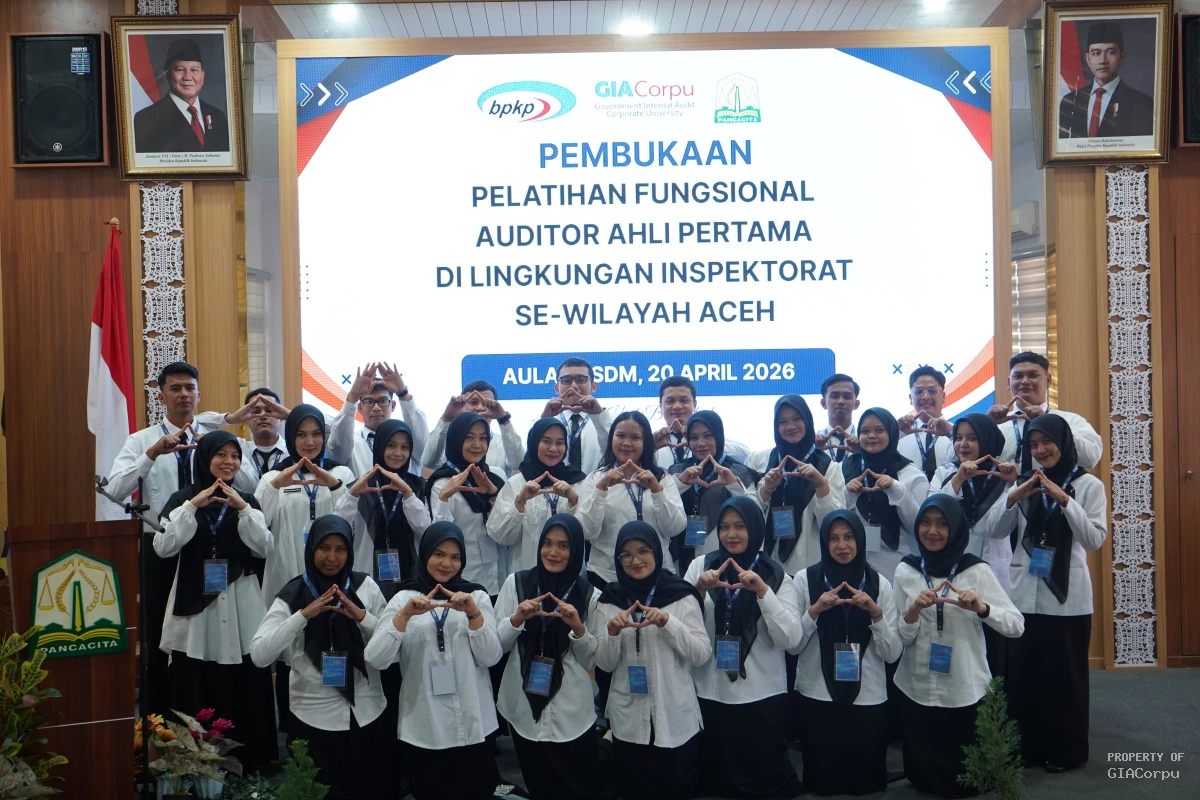 Banda Aceh (20/04/2026) Kepala Perwakilan BPKP Provinsi Aceh, Nanang Agus Sutrisno, Ak., M.Acc telah resmi membuka Pelatihan Fungsional Auditor Ahli Pertama di Lingkungan Inspektorat Sewilayah Aceh pada hari Senin, 20 April 2026. Kegiatan ini dihadiri oleh Inspektur Aceh, Kepala BPSDM Aceh, Sekretaris Inspektorat Aceh, dan instruktur pengajar, serta 82 peserta pelatihan yang berasal dari inspektorat sewilayah Aceh.