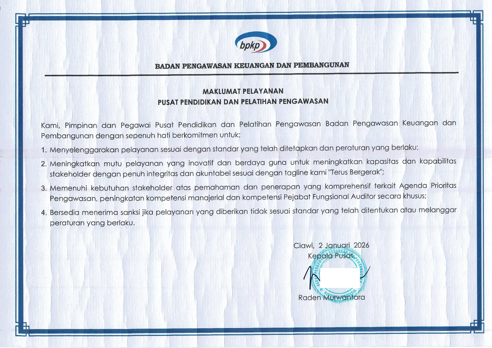 Standar komitmen pelayanan Pusdiklatwas BPKP kepada seluruh stakeholders.